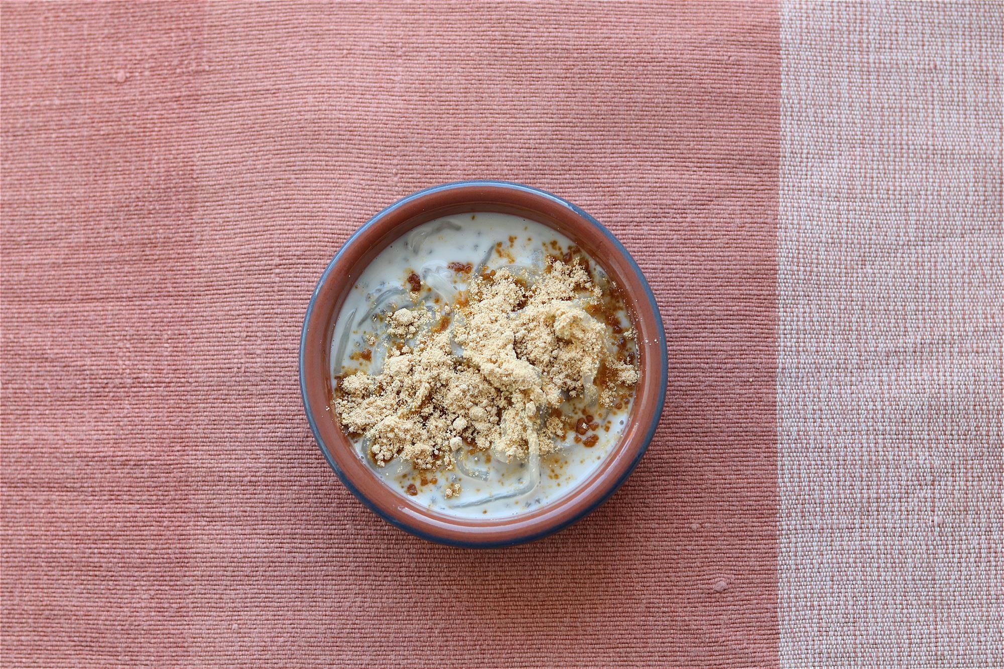Make the topping: mix Soya powder and Sugar in a small bowl