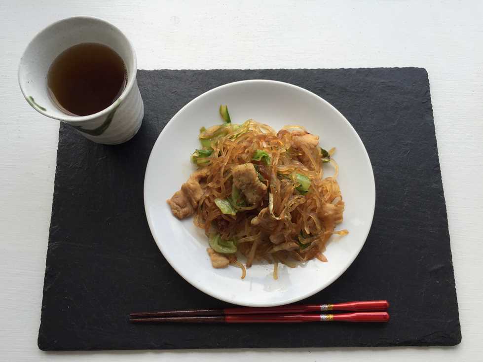 When the pork and cabbage are heated through, add 1 package of prepared DRIED KONYAKU then stir well.